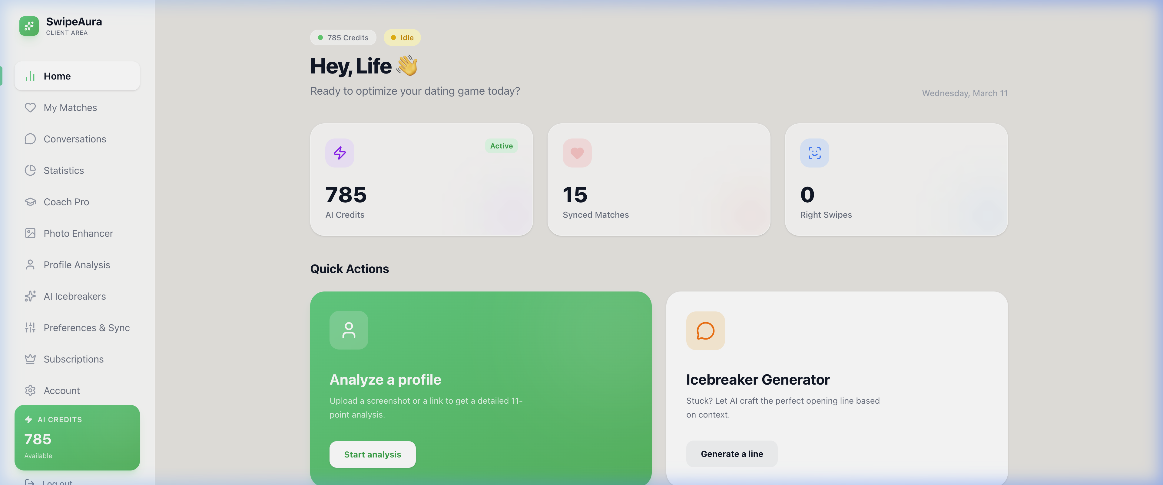 SwipeAura analyzes each profile with 11 criteria. Compatibility score, fake profile detection, first message suggestions.